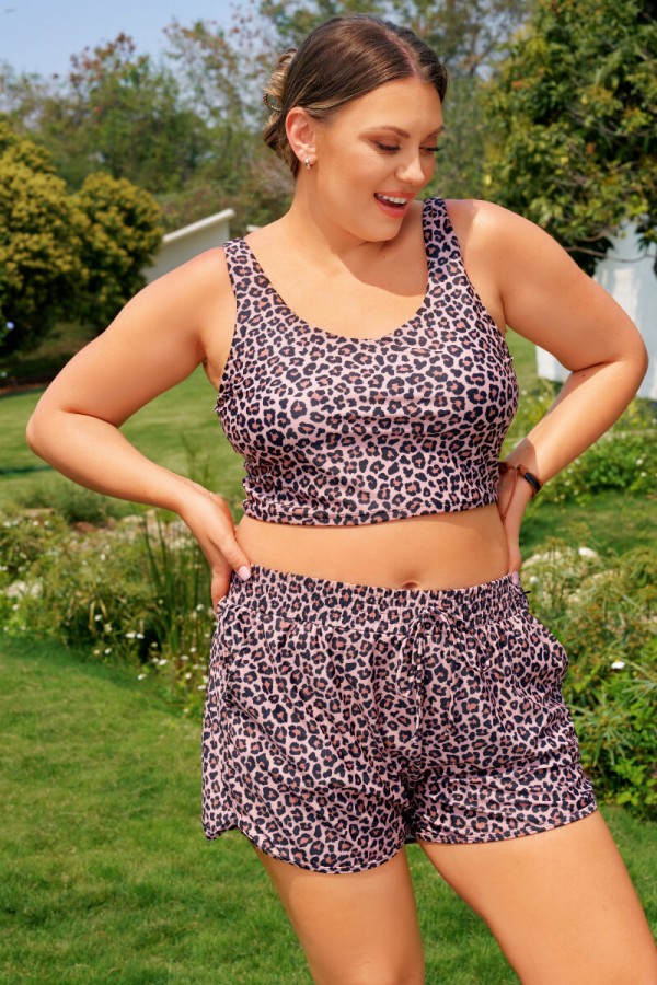 • Leopard Print HighWaisted  Plus Size Bikini Top And Boy Short Set