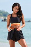 Das sportliche Set aus schwarzem Colorblock-Bikinioberteil mit U-Ausschnitt und breiten Trägern und hochtaillierten Jungenshorts besteht aus einem klassischen Bikinioberteil mit bequemem U-Ausschnitt und nicht verstellbaren Schulterträgern. Patchen Sie eine Shorts mit hoher Taille und elastischem Bund für einen perfekten Strandlook.