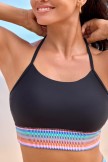 Das schicke schwarze Bikinioberteil hat einen schmeichelnden Rundhalsausschnitt und zarte Spaghettiträger, ergänzt durch ein stilvolles Crossback-Design. Die farbenfrohe Verzierung am Saum verleiht einen witzigen Touch und erleichtert die Kombination mit verschiedenen Badehosen. Perfekt für einen trendigen Look am Pool oder Strand!