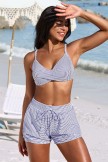 Das Set mit Streifen-Bikinioberteil und Jungenshorts mit hoher Taille und verstellbaren Trägern und herzförmigem Ausschnitt zeichnet sich durch klassische Streifen, ein süßes Twist-Design vorne und ein sexy Cross-Back-Design aus und passt zu Bikini-Jungenshorts im gleichen Muster für einen perfekten Strand-Look.